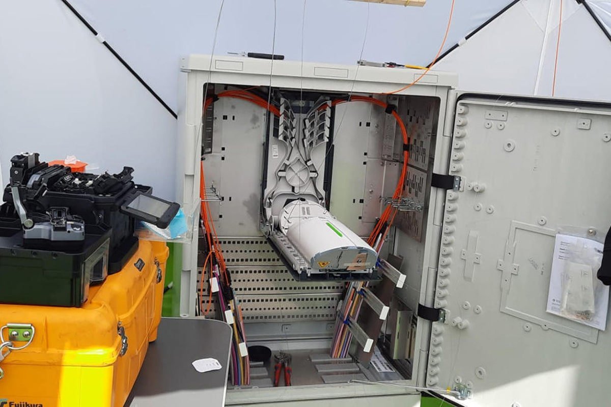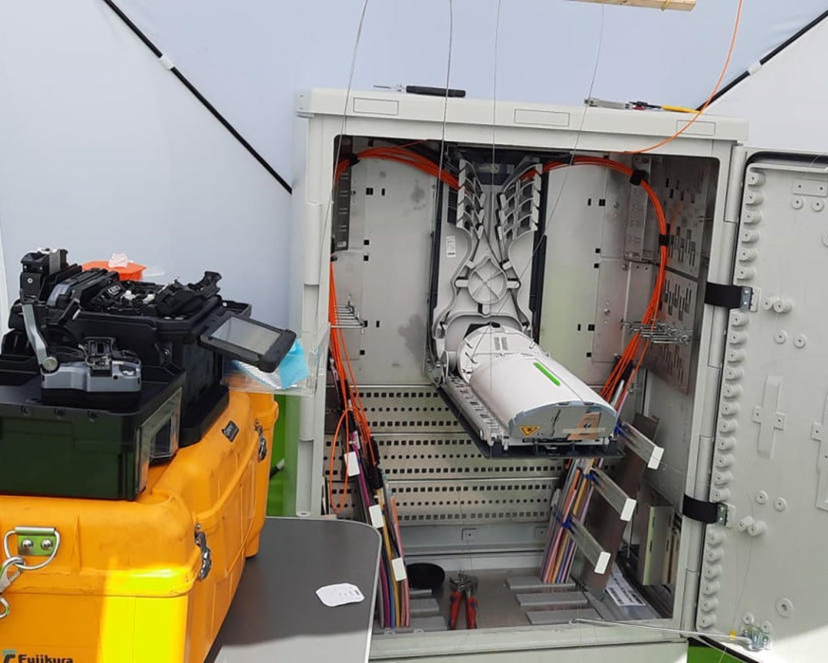 Fachgerechte Installation und präzises Spleißen von Kabelverzweigerschränken für eine zuverlässige Verteilung im Glasfasernetz.